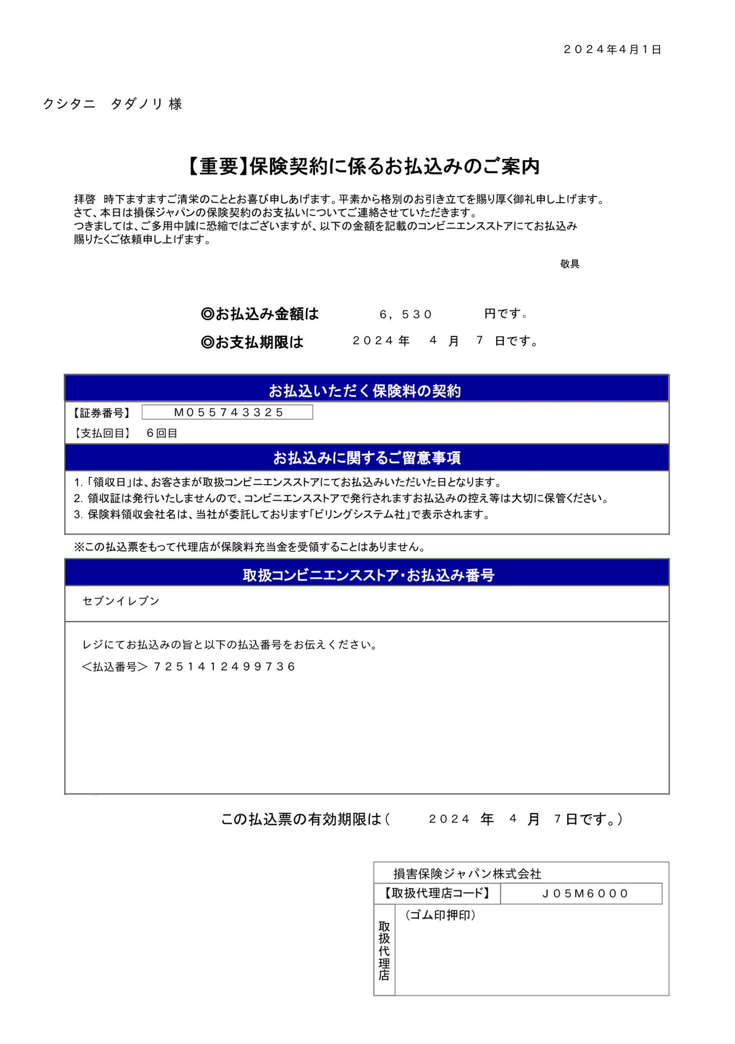 櫛谷 様 火災保険(地震特約)お払込票