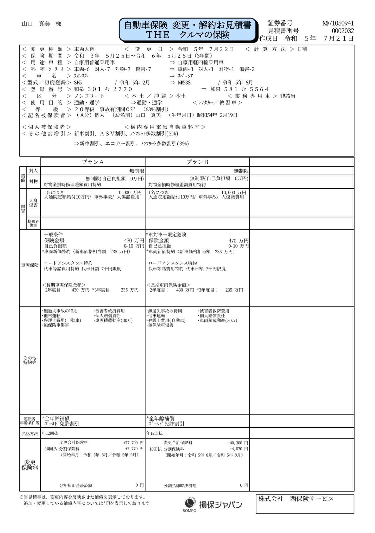 下記の通り、お見積りをお送りさせて頂きます。 ◆プランA:車両保険有り(一般条件)◆プランB:車両保険有り(車対車・限定危険)※プランA.Bの違いについては車両保険をごらんください お客様のお手元に更新完了の通知が届きました後、こちらのサイトは削除されますのでご了承くださいませ。