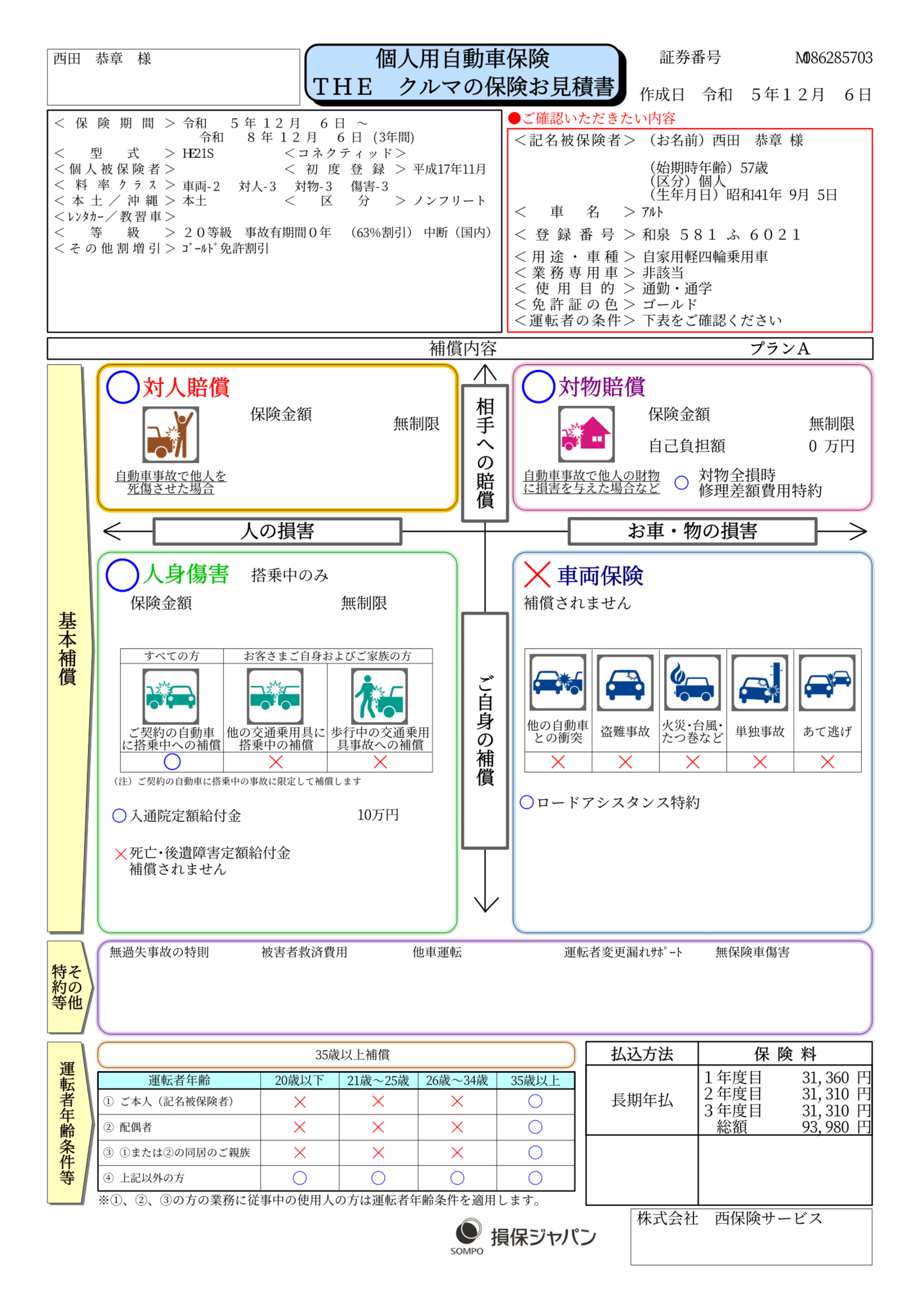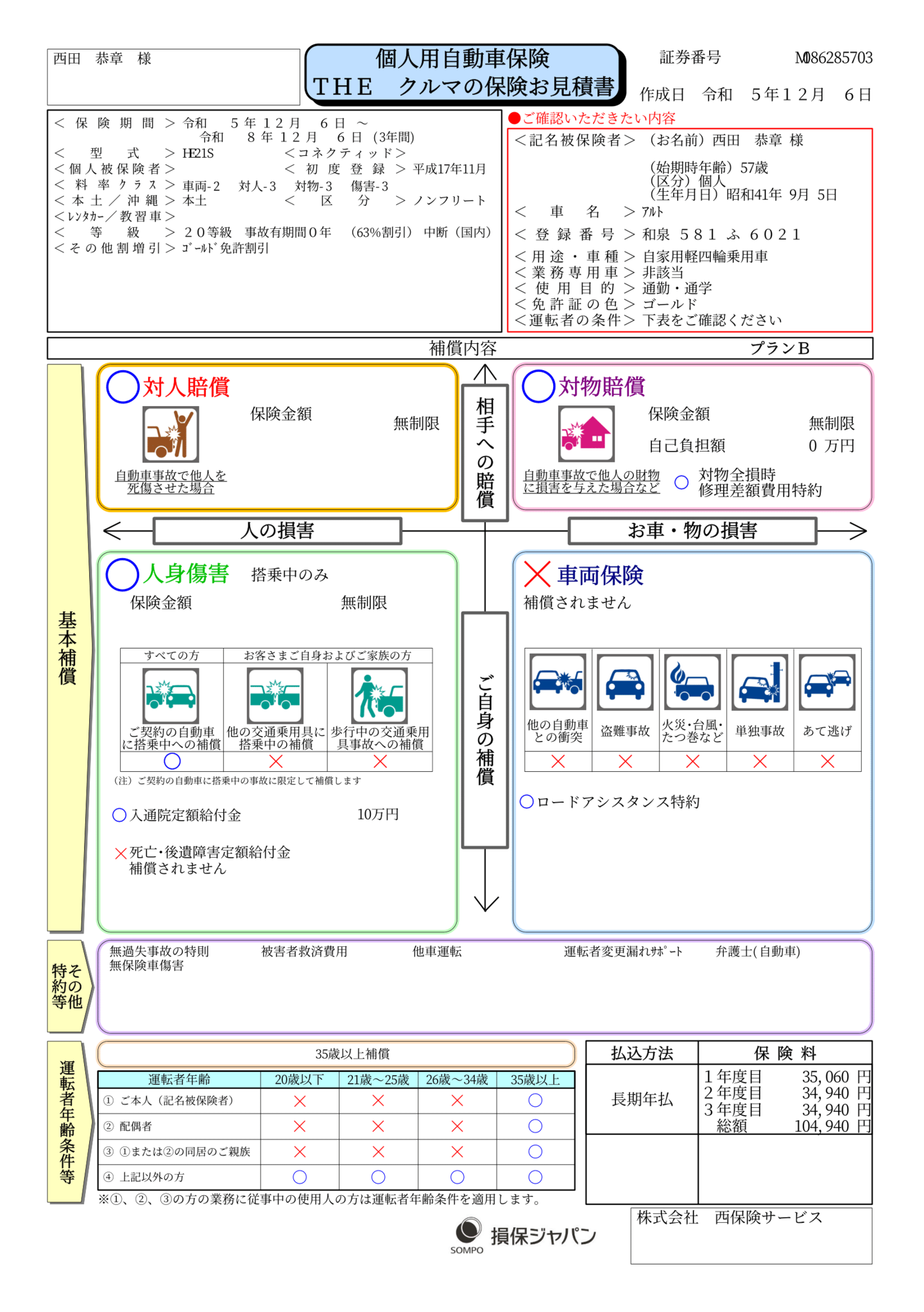 下記の通り、お見積りをお送りさせて頂きます。 ◆プランA:弁護士特約無し◆プランB:弁護士特約有り※弁護士特約はご同居のご家族1台についていればそれで対応できますのでご安心ください お客様のお手元に更新完了の通知が届きました後、こちらのサイトは削除されますのでご了承くださいませ。