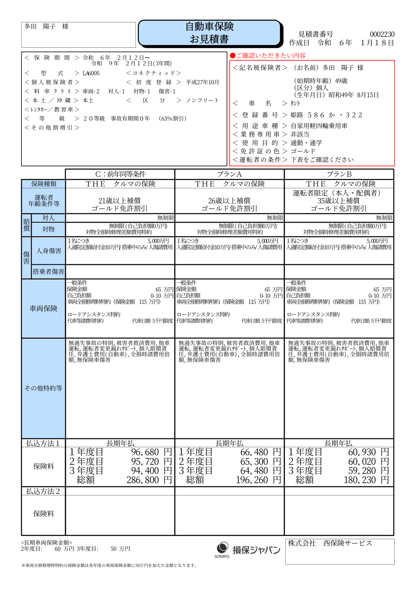 下記の通り、お見積りをお送りさせて頂きます。 ◆1枚目(車両保険 無し)プランA:21歳以上(前年同条件プラン)プランB:26歳以上プランC:35歳以上・運転者限定 ◆2枚目(車両保険 有り)プランA:21歳以上プランB:26歳以上プランC:35歳以上・運転者限定 お客様のお手元に更新完了の通知が届きました後、こちらのサイトは削除されますのでご了承くださいませ。