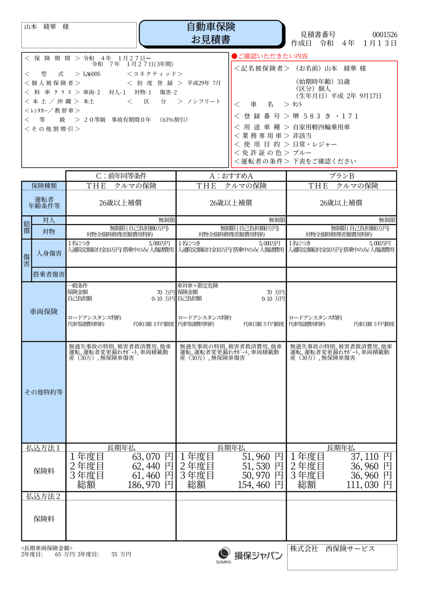 昨年同じプランで、車両保険(お車修理)一般をつけた場合のプランです。