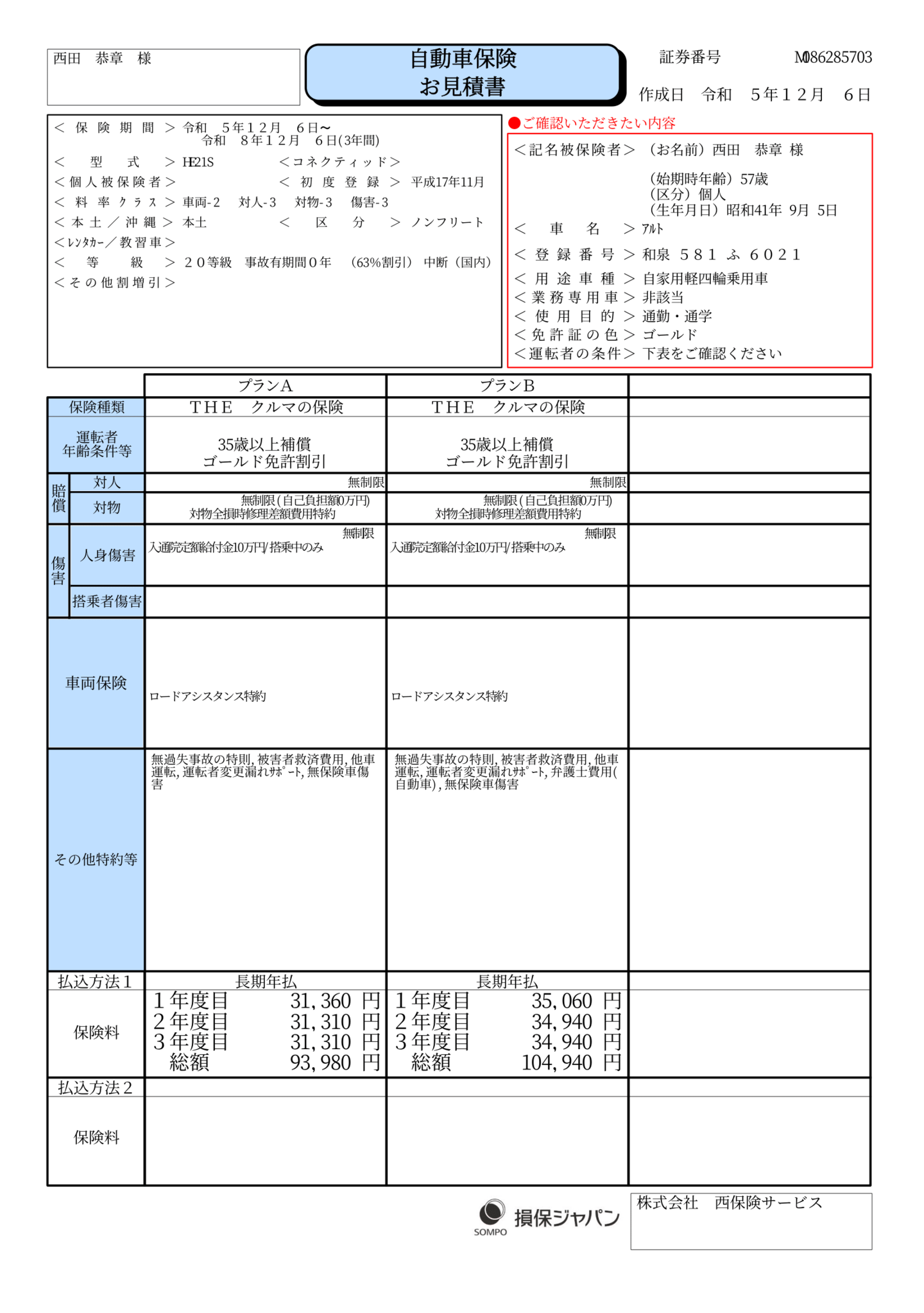 下記の通り、お見積りをお送りさせて頂きます。 ◆プランA:弁護士特約無し◆プランB:弁護士特約有り※弁護士特約はご同居のご家族1台についていればそれで対応できますのでご安心ください お客様のお手元に更新完了の通知が届きました後、こちらのサイトは削除されますのでご了承くださいませ。