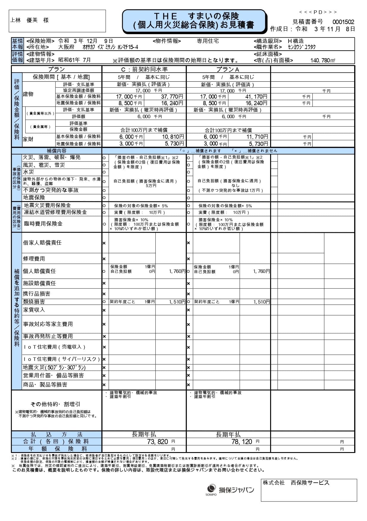 ※前年度保険料・・・67,010円Cプラン(前年同条件)昨年同様のプランです。※免責(自己負担)5万円付帯Aプラン免責(自己負担)削除した場合のプランです。ではご検討のほど何卒よろしくお願い申し上げます。尚、お客様のお手元に更新完了の通知が届きました後、こちらのサイトは削除されますのでご了承くださいませ。